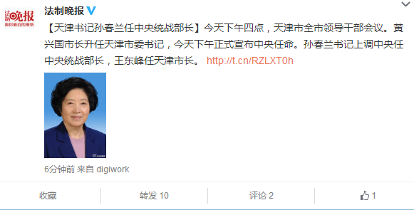 关键词:天津市 天津市委书记 孙春兰 中央统战部 部长