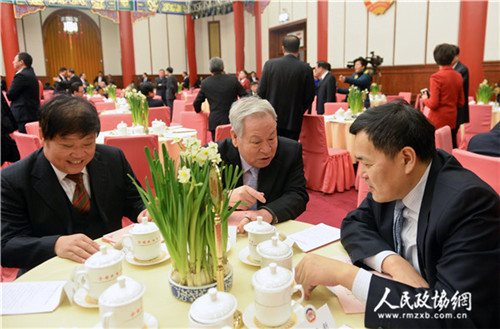 2014年12月31日,全国政协在北京举行新年茶话会。参加茶话会的政协委员们在一起亲切交谈。段敦厚委员、顾秉林委员、钱克明委员(从左至右)在一起亲切交谈。记者 姜贵东 摄