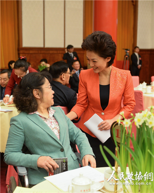 张海迪委员(左)和海霞委员在一起亲切交谈。记者 姜贵东 摄