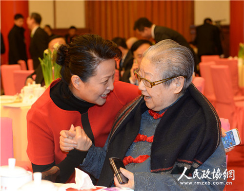 李羚委员(左)和李世济委员在一起亲切交谈。