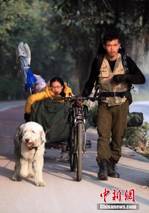01月03日,广西壮族自治区柳州市,柳州85后小伙丁一舟,为完成患病女友心愿,用一辆单车,一只工作犬,拉着女友的轮椅,1月3日从柳州出发开始爱心之旅。他们准备环游中国,在地图上“走”出一个心形路线。丁一舟女友患有遗传性小脑共济失调症,俗称企鹅病,无法正常走路,吃饭吞咽都很艰难?;酚沃泄美阎刂兀轿荒昵崛吮硎境刹怀晒Σ恢匾?,重要的是追求梦想的过程,为了这次长途旅行,1日2日,两人已经在柳州市区“预热”徒步、露营两天。