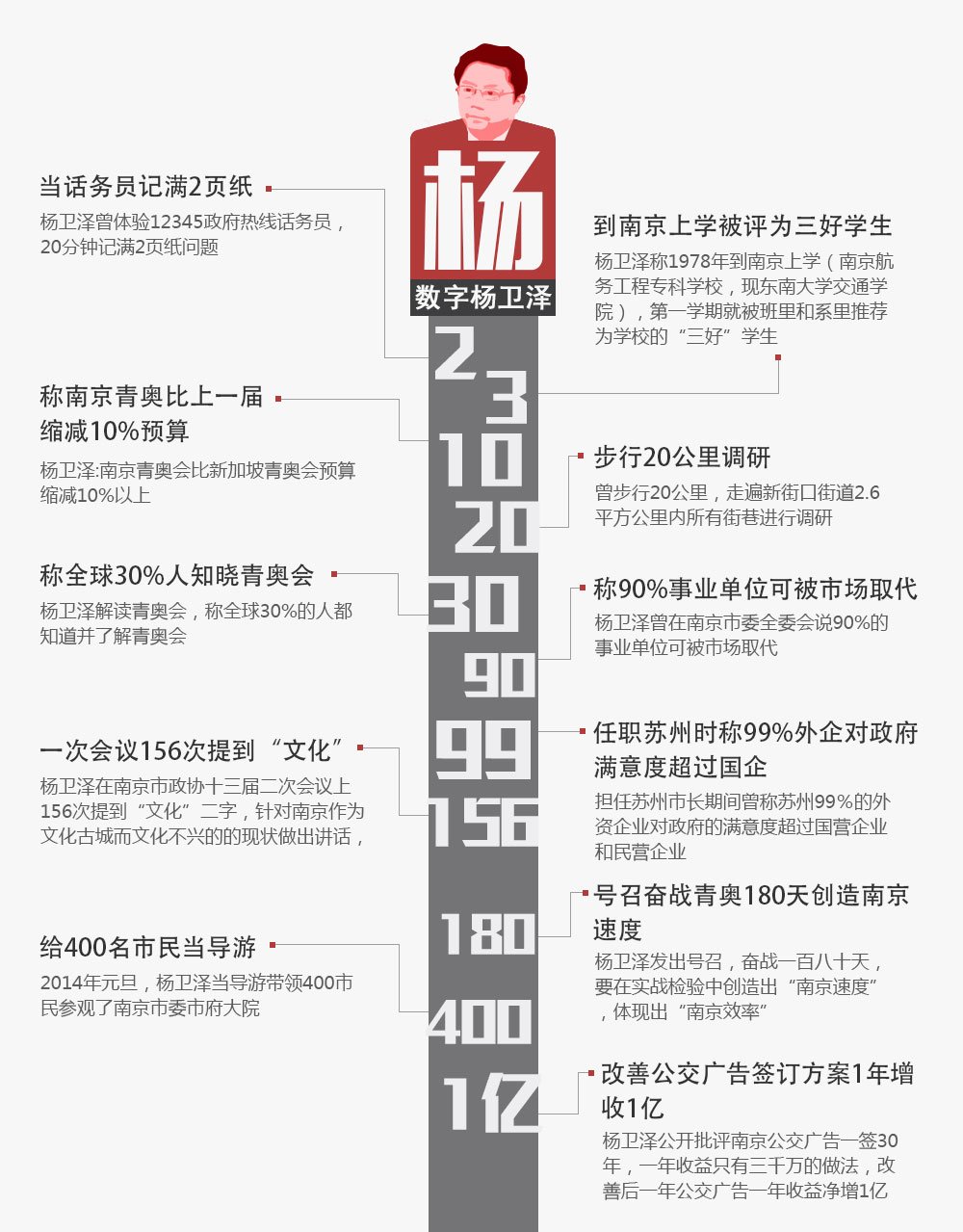 据中国经济网地方党政领导人物库资料显示,杨卫泽出生于1962年,曾任江苏省交通厅厅长,苏州市长,无锡市委书记等职务。2011年3月起任南京市委书记,与时任南京市市长的季建业有过交集。