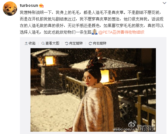 原标题:孙俪新剧中拒穿真皮草 网友:点一万个赞(图)