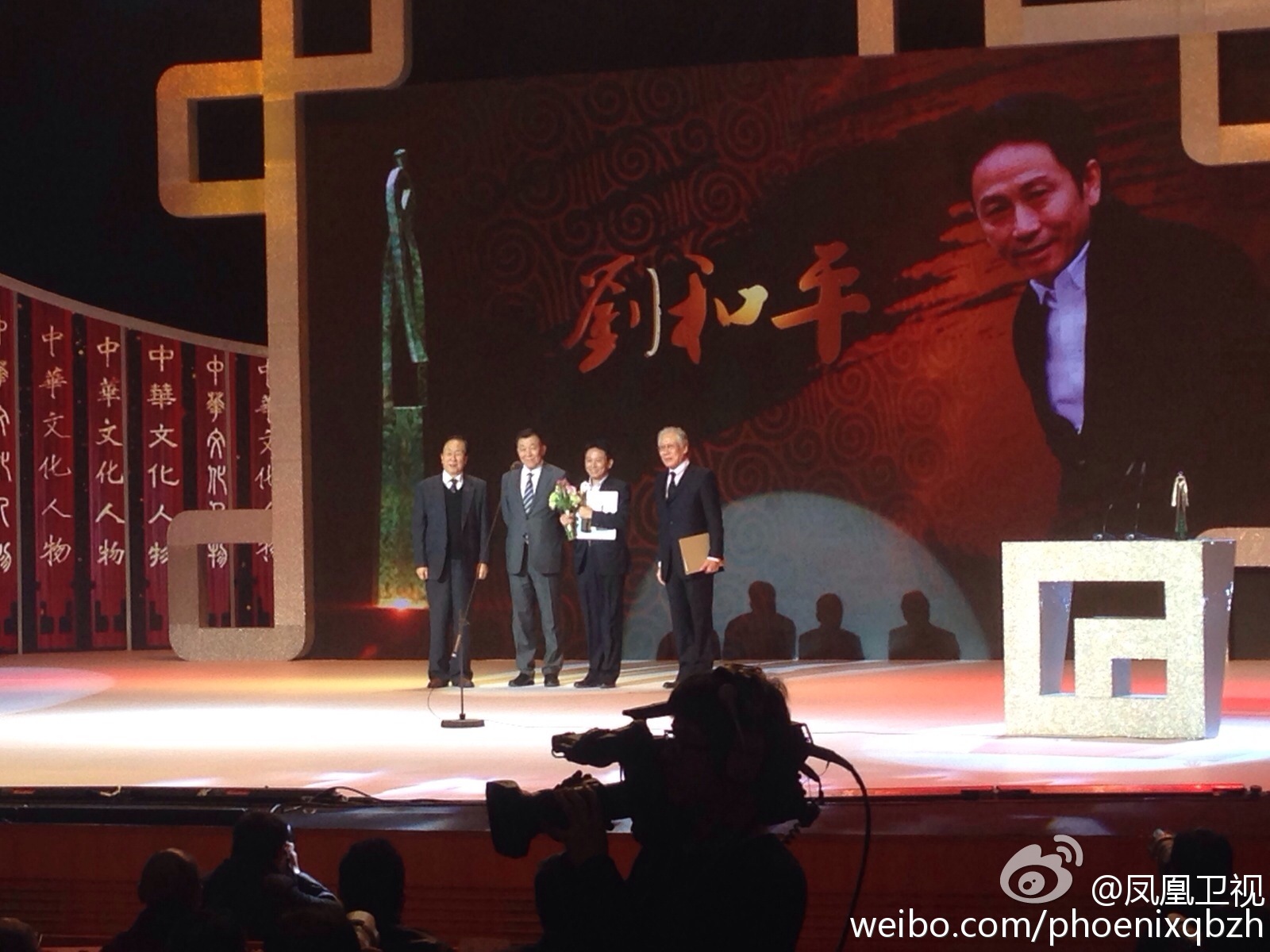 1月6日,由中华文化促进会、凤凰卫视联合主办的“2014中华文化人物”颁授典礼在湖北武汉落幕。叶嘉莹、郭兰英、刘和平、周韶华等12人获得殊荣。图为刘和平领奖。