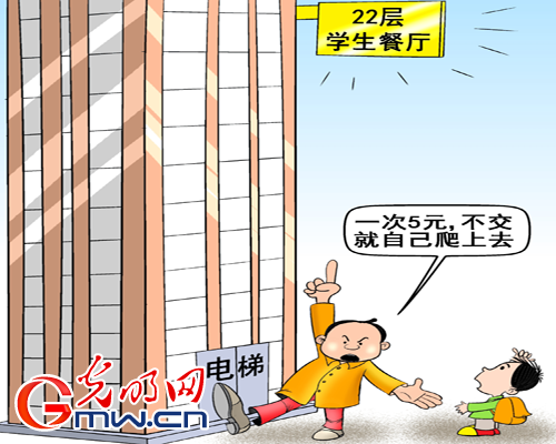 2015年1月6日消息,昆明,近日,红旗小学靖国校区的数十名学生和家长,到位于学校附近的靖国大厦吃小饭桌时发现:大厦业主委员会贴出通知:“吃小饭桌每人每次坐电梯交5元,拒交费,请走楼梯。”靖国大厦的3家小饭桌,分别位于5、20及22层楼,有些爬到20和22层的孩子都累哭了。对此,靖国大厦物管处回应称,提出这一要求是出于安全考虑,贴出通知后至今未收到一分钱。(据1月5日 新华网)