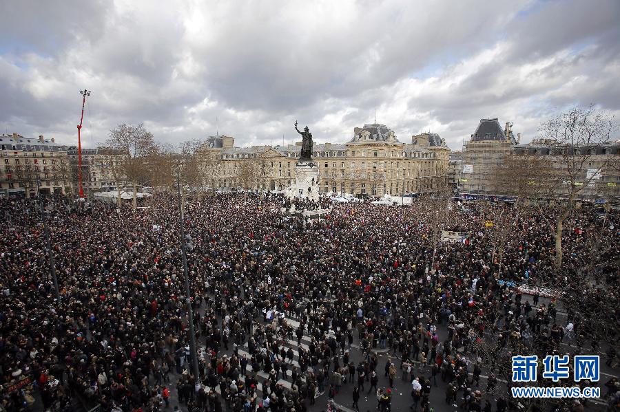 1月11日,在法国巴黎,游行者聚集在共和国广场。当日,法国政府在巴黎城区举行反恐大游行,法国总统奥朗德以及多位外国领导人参加游行,向近日倒在恐怖分子枪下的逝者致敬。 新华社/美联