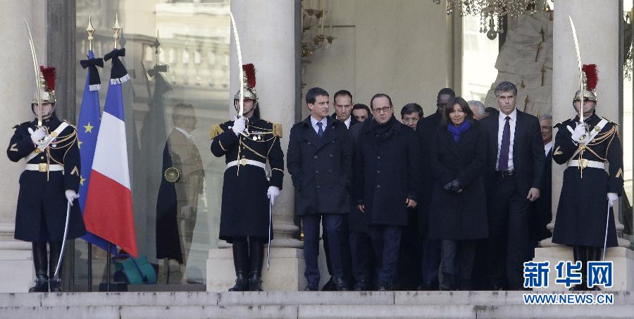 1月11日,在法国巴黎,法国总统奥朗德(中)等政府官员离开总统府爱丽舍宫参加游行。当日,法国政府在巴黎城区举行反恐大游行,法国总统奥朗德以及多位外国领导人参加游行,向近日倒在恐怖分子枪下的逝者致敬。 新华社/美联