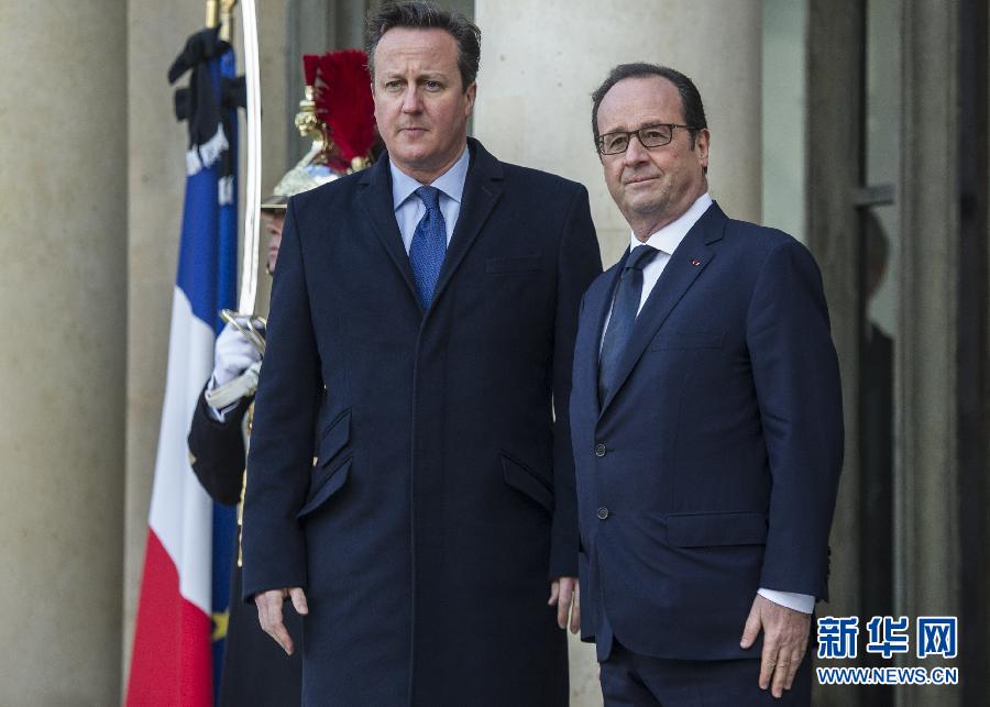 1月11日,在巴黎爱丽舍宫,法国总统奥朗德(右)迎接参加游行的英国首相卡梅伦。当日,法国政府在巴黎城区举行反恐大游行,法国总统奥朗德以及多位外国领导人参加游行,向近日倒在恐怖分子枪下的逝者致敬。新华社记者陈晓伟摄