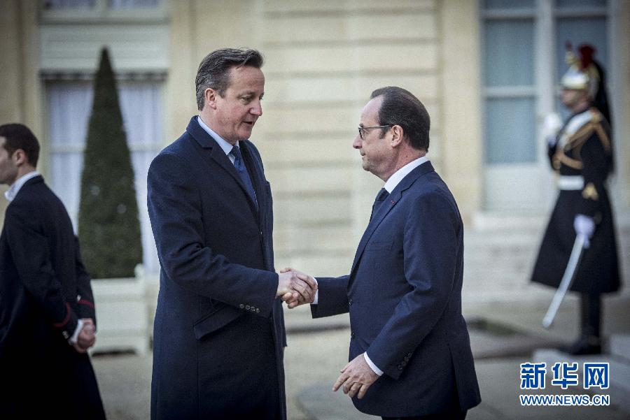 1月11日,在巴黎爱丽舍宫,法国总统奥朗德(右)迎接参加游行的英国首相卡梅伦。当日,法国政府在巴黎城区举行反恐大游行,法国总统奥朗德以及多位外国领导人参加游行,向近日倒在恐怖分子枪下的逝者致敬。新华社记者陈晓伟摄