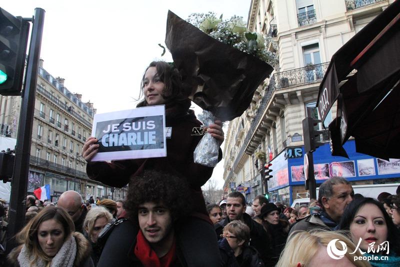 人民网巴黎1月11日电 (记者李永群)1月11日下午,法国300万人走上街头,举行反恐大游行。巴黎的反恐大游行由于50余个国家领导人参加而受到世界瞩目,游行从共和国广场出发,走向民族广场 。一路上记者在现场听到人们高唱《马赛曲》,高呼“我们不怕,我们是查理”等口号,反对恐怖主义。走在队伍前列的是巴黎恐怖袭击案受害者家属,随后是法国总统奥朗德、德国总理默科尔、英国首相卡梅伦等各国政要,他们手臂相挽,与巴黎150万群众一起表达对恐怖主义行径的抗议,表示团结一致共同反对恐怖主义的决心。摄影:李永群
