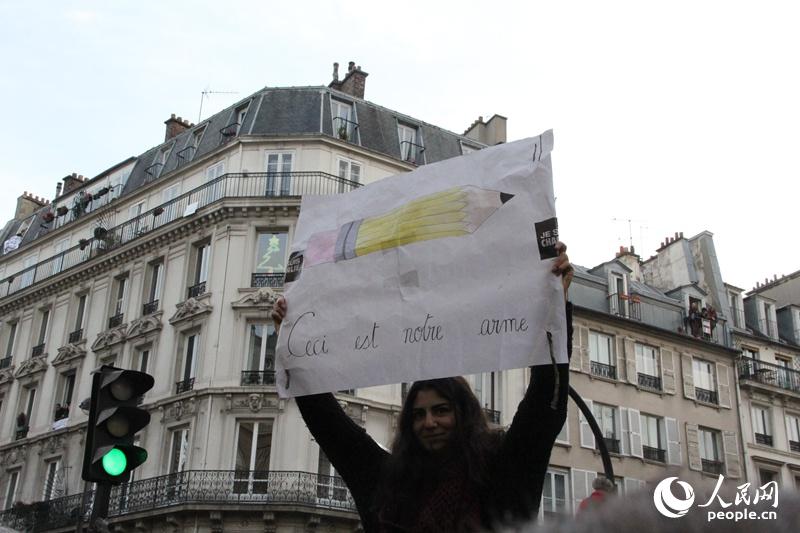 人民网巴黎1月11日电 (记者李永群)1月11日下午,法国300万人走上街头,举行反恐大游行。巴黎的反恐大游行由于50余个国家领导人参加而受到世界瞩目,游行从共和国广场出发,走向民族广场 。一路上记者在现场听到人们高唱《马赛曲》,高呼“我们不怕,我们是查理”等口号,反对恐怖主义。走在队伍前列的是巴黎恐怖袭击案受害者家属,随后是法国总统奥朗德、德国总理默科尔、英国首相卡梅伦等各国政要,他们手臂相挽,与巴黎150万群众一起表达对恐怖主义行径的抗议,表示团结一致共同反对恐怖主义的决心。摄影:李永群