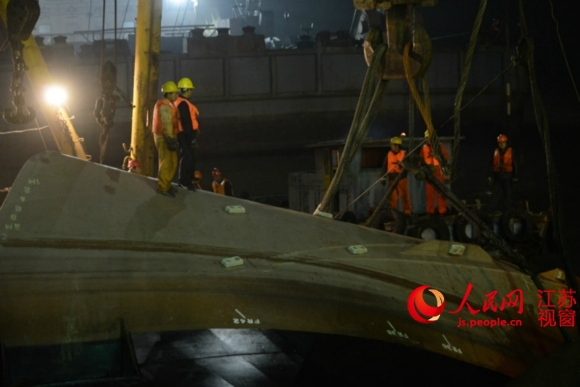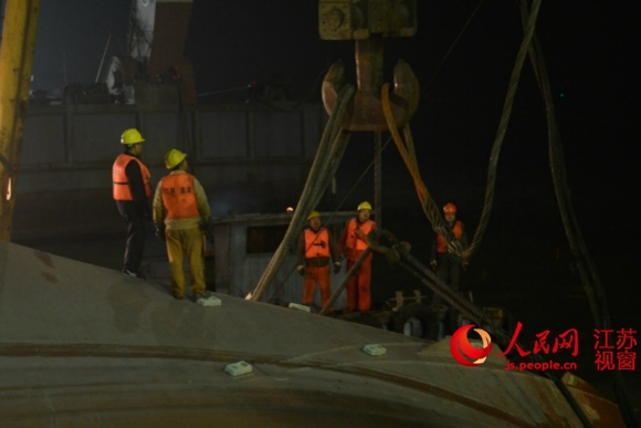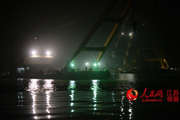由于所沉船只重达300多吨,船体下部系圆形,给打捞工作带来较大困难,自事发后十小时左右,才开始实施第四根钢缆的捆绑工作。现场指挥人员还告诉记者,事故发生后,张家港、江阴、泰州等海事部门共出动36艘救援船只,300多名救援队员参与救援工作。目前,沉船原因仍有待调查,但据相关部门初步判断,所沉船只系由安徽蚌埠行至靖江博泰船厂实施舾装作业后,未经主管部门批准擅自试航引发事故。