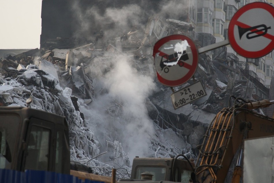 2015年1月18日,哈尔滨,距离哈尔滨市道外区太古街大火塌楼事故已过去半个月的时间。由于下面的灰烬仍没有完全熄灭,废墟上仍有白烟冒出。扭曲变形的钢筋外冻了一层冰,如末日场景。