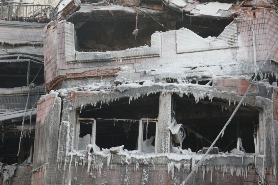 哈尔滨大火塌楼现场遭冰封如末日场景