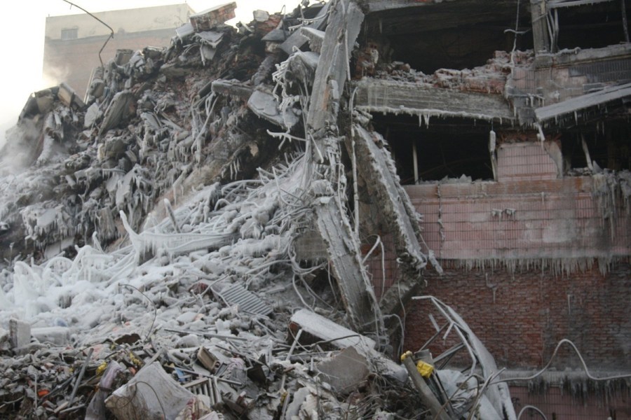 2015年1月18日,哈尔滨,距离哈尔滨市道外区太古街大火塌楼事故已过去半个月的时间。由于下面的灰烬仍没有完全熄灭,废墟上仍有白烟冒出。扭曲变形的钢筋外冻了一层冰,如末日场景。