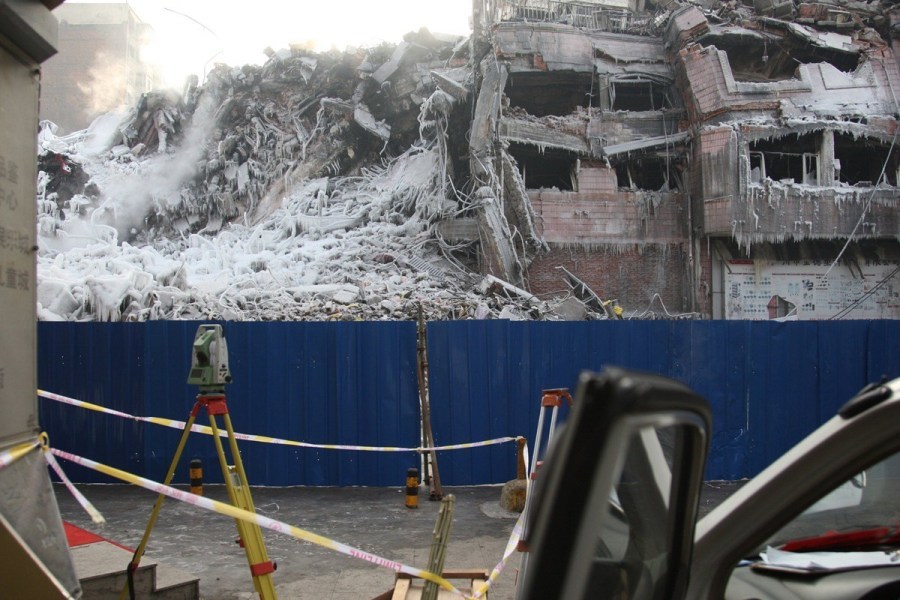 2015年1月18日,哈尔滨,距离哈尔滨市道外区太古街大火塌楼事故已过去半个月的时间。由于下面的灰烬仍没有完全熄灭,废墟上仍有白烟冒出。扭曲变形的钢筋外冻了一层冰,如末日场景。