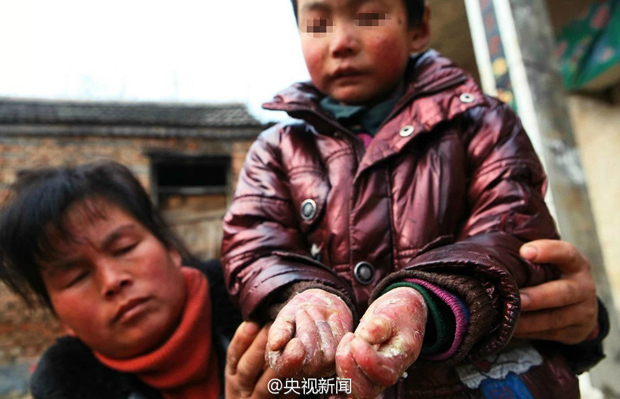 因为病情,他的双手没了指甲,皮肤全是溃烂和脱皮,除了大拇指以外,其余4个手指已经“长”在了一起。虽然如此,但宋刘臣还在不停地用残缺的右手拿着铅笔在课本上写着字。他的脸,也能看到多处皮肤破损的情况。额头上的一处,还有着血迹。
