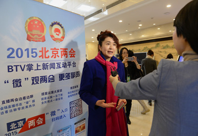 北京市政协十二届三次会议下午三时开幕。 图为1月21日上午,北京五洲大酒店委员驻地,前来报道的委员接受媒体记者采访。