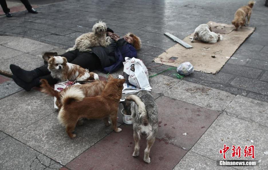 2015年1月20日,在贵阳市喷水池,一位7旬老人胸挂“流浪狗要饭团”的纸牌,在地上写了很多呼吁大家?;ち骼斯返奈淖郑胍蝗撼栉锕吩诮滞菲蛱?,许多市民见状解囊施舍,老人连忙双手合拳说:好人一生平安。老人76岁,他与宠物狗们差不多每天都在大十字、喷水池、紫林奄、老客车站等地段走一遍,乞讨来的钱,除了养这些捡来的流浪狗,就是自己生活。