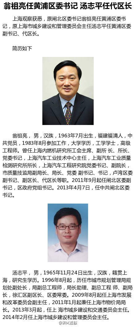 据悉,原闸北区委书记翁祖亮任黄浦区委书记,原上海市城乡建设和管理委员会主任汤志平任黄浦区委副书记、代区长。