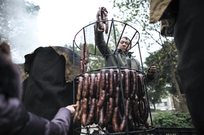 2014年12月30日8时许,重庆巴南区毛纺厂,居民将风干的香肠挂上熏架。每年这时候,居民们就会熏制香肠、腊肉、排骨等过年食物。