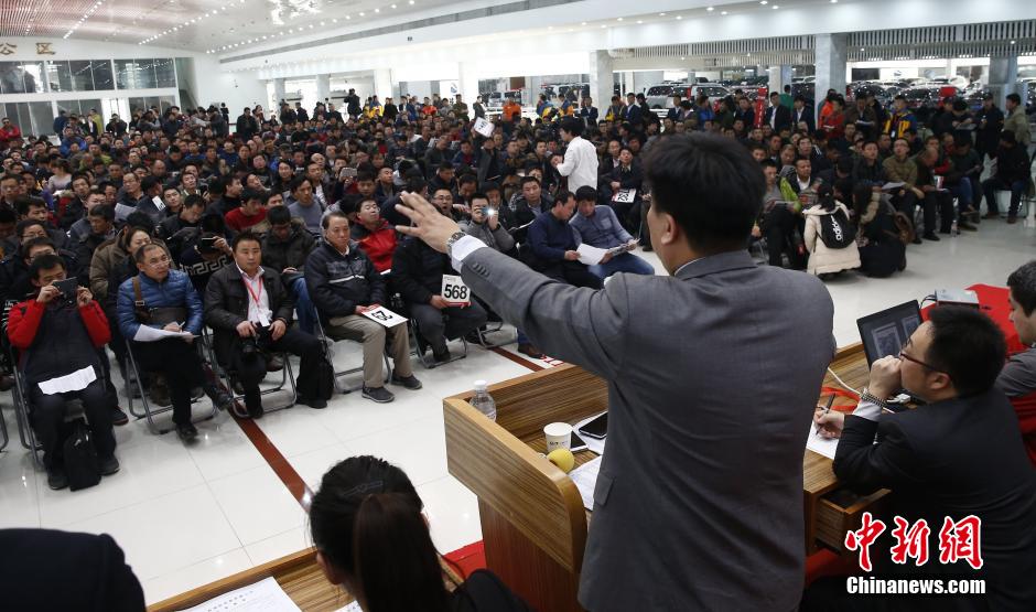 1月25日,中央和国家机关公车改革取消车辆首场拍卖会在北京中拓国际拍卖有限公司举行。据悉,首批中央和国家机关公车改革取消车辆拍卖共涉及300余辆公车,分三次进行拍卖。1月25日在北京中拓国际拍卖有限公司举行首场拍卖后,北京北汽鹏龙机动车拍卖有限公司和北京花乡拍卖有限公司的拍卖将分别在1月26日和2月1日进行。图为拍卖师举锤。中新社发 张浩 摄