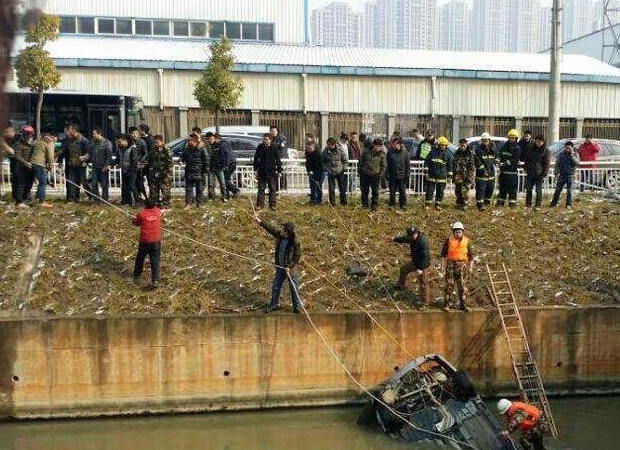 事发后,虽然有市民试图下水救援,无奈轿车距岸边较远,水较深。半小时后,消防人员赶到现场,用绳索将车拖到水渠边,搭梯爬上车,打开副驾车门,从车内拉出三男一女。车上4人,2人当场死亡,另一男一女被送往同济医院,后经抢救无效死亡。图为事发现场。