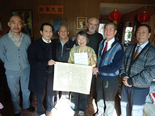 加拿大华侨文化?;び敕⒄剐岢N窭硎鹿厮肷?、副会长胡志勇、张雄长(左起1至3) 及张哲旋、顾问伍川宇(左6及7) 接受王华莹夫妇(左4及5) 捐出日本军用地图,并向他们颁发感谢状。(加拿大《北美时报》)