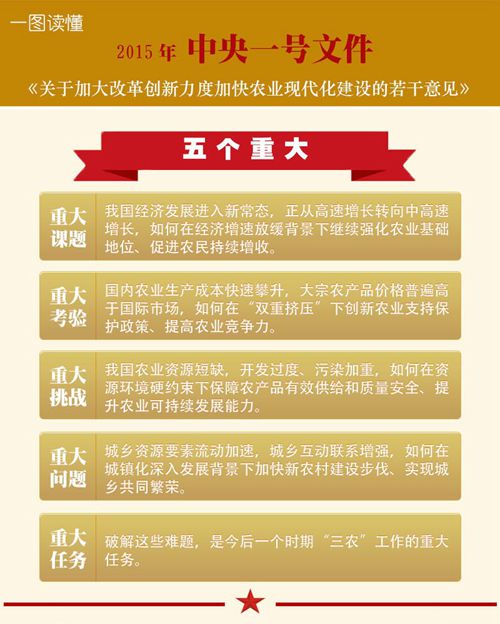 2015年中央一号文件继续锁定“三农”,表明“三农”问题在中国“重中之重”的地位非但没有弱化,反而更为加强。正如《意见》所指出的,“如何在经济增速放缓背景下继续强化农业基础地位、促进农民持续增收,是必须破解的一个重大课题。”“如何在城镇化深入发展背景下加快新农村建设步伐、实现城乡共同繁荣,是必须解决好的一个重大问题。”