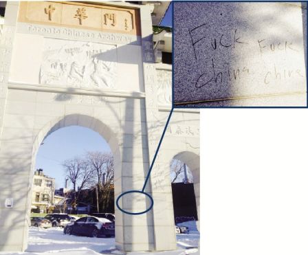 关键词:多伦多牌楼 涂鸦辱华 多伦多华埠地标牌楼遭涂鸦辱华 辱华