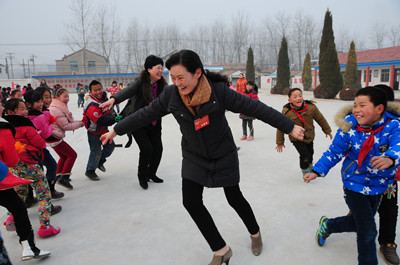 江苏省淮安市政协七届四次会议期间,委员们通过大会发言、提案、反映信息等形式,呼吁社会关注农村留守儿童成长。1月21日,妇联界委员利用会议间隙走进涟水县保滩镇永兴小校调研农村留守儿童学习生活情况,为孩子们送去学习、体育等用品,并和他们一同玩游戏、合影,让他们感受到社会大家庭的温暖。(田晶何强 摄)