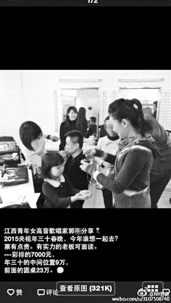 昨日上午,网友“NY智勇”在微博中发布消息称,一名女歌手在自己的微信朋友圈中发消息兜售2015年春晚的门票。根据这名网友提供的图片,一位微信昵称为江西青年女高音歌唱家郭某的朋友圈图片中,写着有关春晚门票交易的的内容。