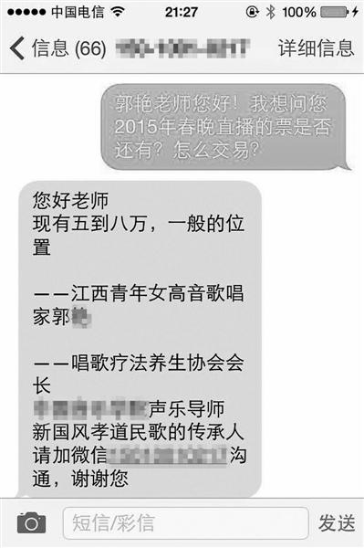 昨日下午,记者按照她的要求,发送短信询问春晚门票的详情,随后对方回复短信,称现有5到8万元的一般位置的门票,并要求添加微信详谈。在短信中,对方还称自己就是江西青年女高音歌唱家、歌唱疗法养生协会会长郭某。