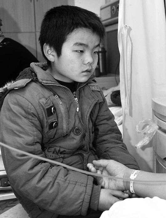 看着消瘦和脱发的爸爸,小延彬不停地流泪?!”颈钦?张中 摄