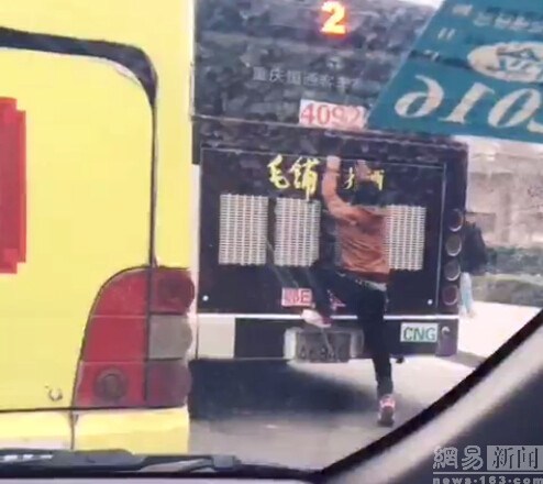 关键词:男子为省1块钱扒公交车车尾 中途换扒 男子扒公交车车尾 为省1块钱