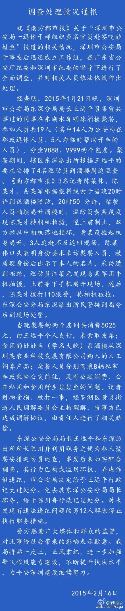 另据南方都市报报道 就《南方都市报》关于“深圳市公安局一退休干部组织多名官员赴宴吃娃娃鱼”报道的相关情况,深圳市公安局于事发后迅速成立工作组,在广东省公安厅纪委和深圳市纪委的督导下进行了全面调查,并对相关人员依法依规作出处理。