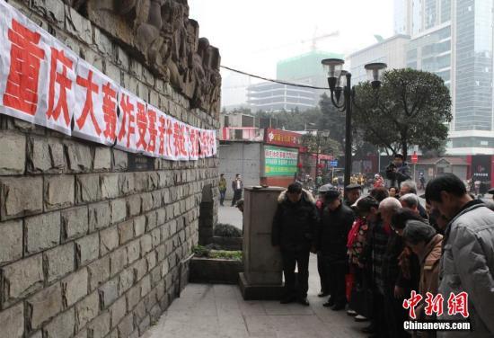 中新社重庆2月13日电 (唐枫)13日,百余重庆大轰炸遇难者家属在位于重庆较场口的大轰炸纪念馆前,为即将于25日赴日听取对日索赔一审判决的索赔团成员壮行。这将为“十年索赔之路”给出一份答卷。