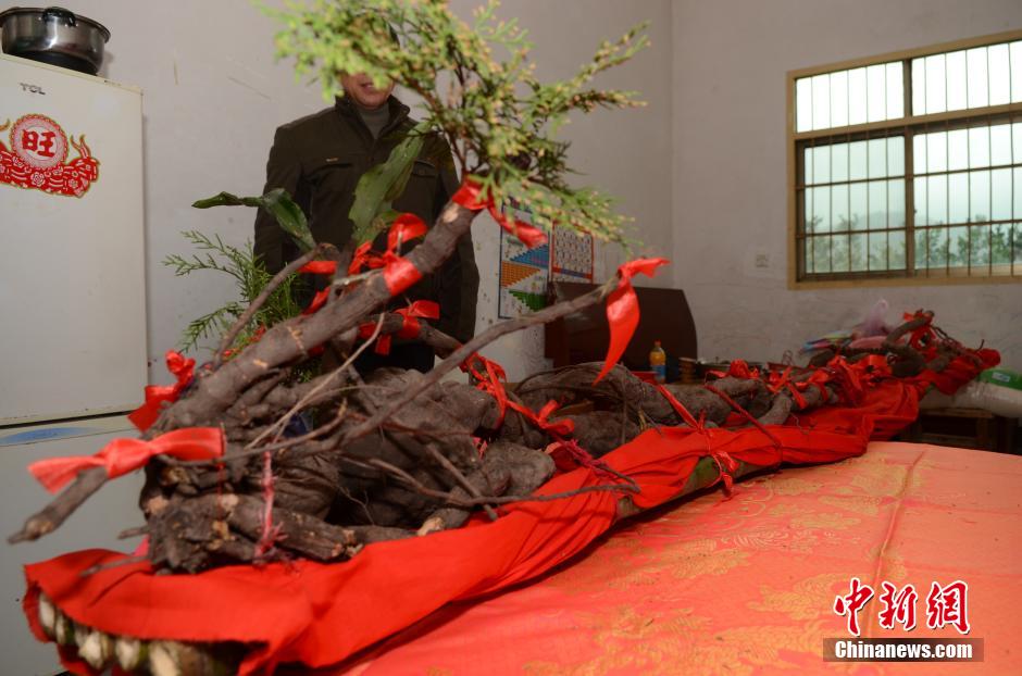 2月25日,在浙江省金东区源东乡山下施村施贤贵家中,一株重达23斤,长达3.3米的疑似何首乌的根状物,吸引了不少村民围观。该根状物形似神话中的龙,施贤贵用红布条绑上万年青、柏树枝等加以装饰,以增添新年喜气。据悉,该根状物是施贤贵两天前在村边一山上的悬崖边发现,为保持根须完整,他和儿子徒手花了两天时间将其挖出。中新社发 邵勤旦 摄