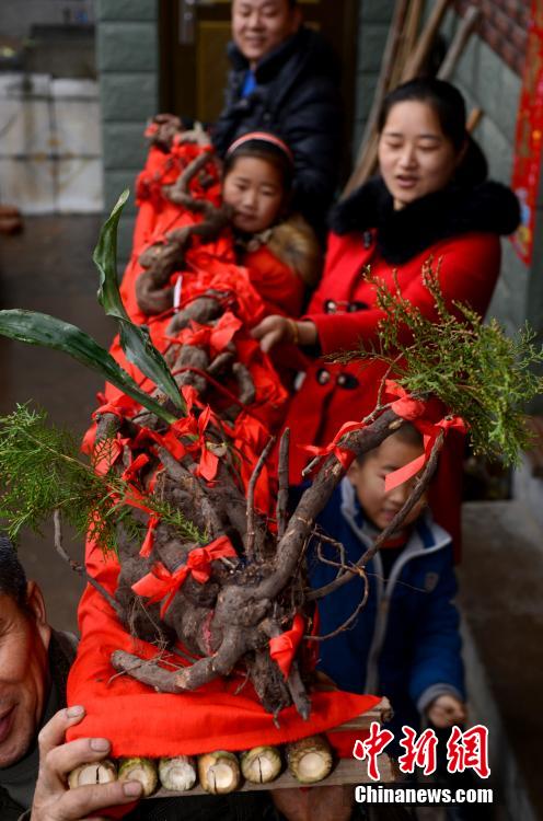 2月25日,在浙江省金东区源东乡山下施村施贤贵家中,一株重达23斤,长达3.3米的疑似何首乌的根状物,吸引了不少村民围观。该根状物形似神话中的龙,施贤贵用红布条绑上万年青、柏树枝等加以装饰,以增添新年喜气。据悉,该根状物是施贤贵两天前在村边一山上的悬崖边发现,为保持根须完整,他和儿子徒手花了两天时间将其挖出。中新社发 邵勤旦 摄