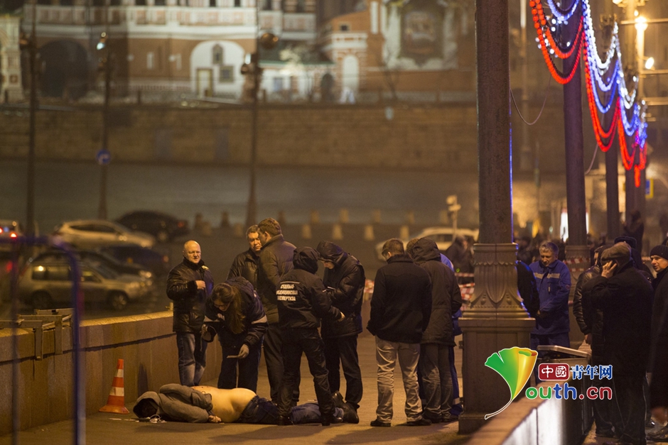 当地时间2015年2月28日,俄罗斯莫斯科,警察在鲍里斯-涅姆佐夫的尸体旁进行调查。据国外媒体报道,俄罗斯反对派政治家、前副总理鲍里斯-涅姆佐夫遭射杀身亡。据悉,事发时涅姆佐夫走在克里姆林宫附近的大街上,身份不明的凶手朝他开枪。涅姆佐夫在叶利钦在任时期曾任第一副总理,现猛烈批评总统普京,经常组织街头游行,并揭露官员贪腐,他原定在3月1号出席莫斯科一个反对派的大型游行?! ⊥计鹈篜avel Golovkin/东方IC