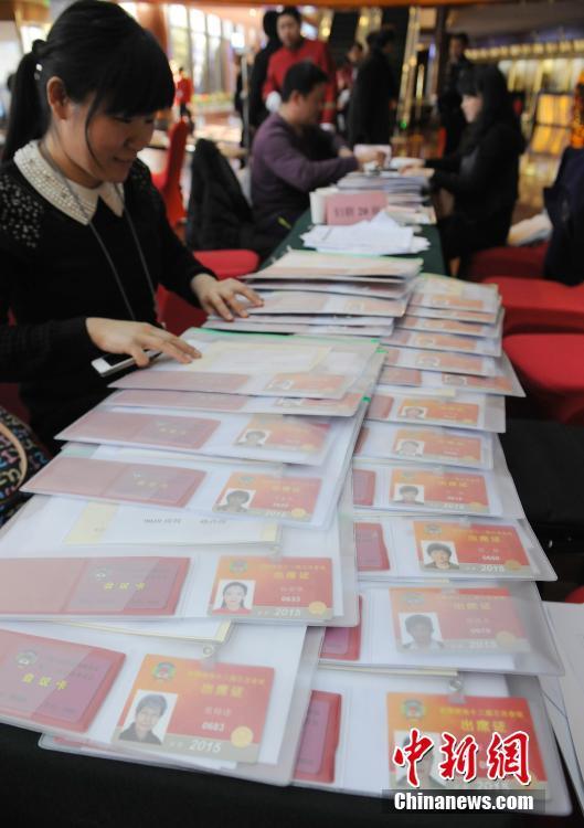 3月1日,北京国际饭店驻地的工作人员整理政协委员的出席证件,等候参加全国政协十二届三次会议的委员前来报到。中新社发 侯宇 摄