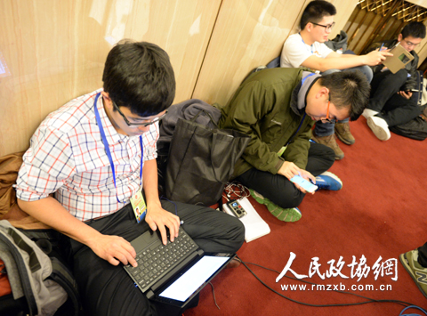 人民政协网北京3月2日讯(记者 田福良)3月2日,即将召开的全国政协十二届三次会议共有3100余名海内外记者报名参加,报名参会记者人数已超过全国政协委员人数。记者报道大军中每个平凡的个体都在各自的角落里默默工作着。现场报道、发稿、再跑会....如此反复就把最新的政策和两会新闻带给大众。图为记者在现场就地发稿。人民政协网记者 贾宁 摄