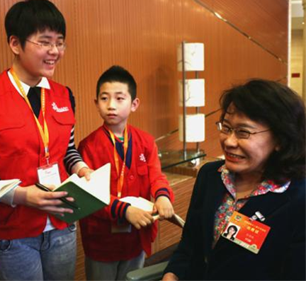 人民政协网北京3月7日讯  昨天下午,社会保障与社会福利界别小组讨论间隙,张海迪委员在会场外被记者“围堵”,不过,这次围堵她的不是相机与闪光灯组成的“长枪大炮”,而是一群拿着录音笔的两会小记者。