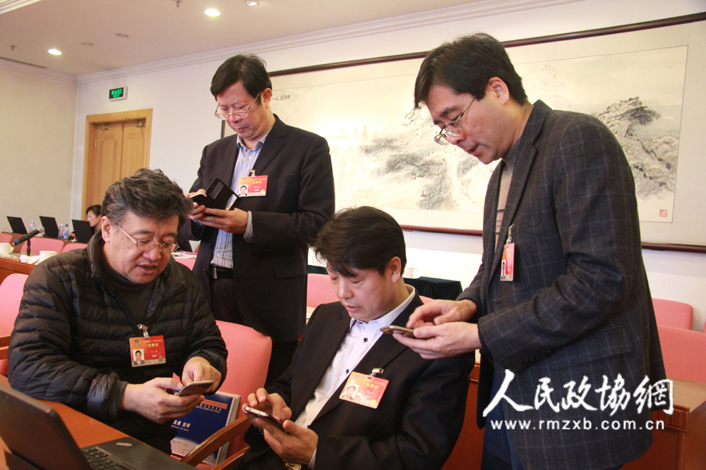 “加我,加我,平时好联系,还能就提案交换意见,这多方便啊!”在医卫界杨金生委员(中)的提议下,同组的何伟委员(左)、林绍彬委员(左二)、王大明委员(右)凑在一起“互相扫”。 人民政协网记者 李木元 摄