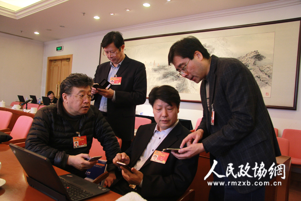 “加我,加我,平时好联系,还能就提案交换意见,这多方便??!”在医卫界杨金生委员(中)的提议下,同组的何伟委员(左)、林绍彬委员(左二)、王大明委员(右)凑在一起“互相扫”。 人民政协网记者 李木元 摄