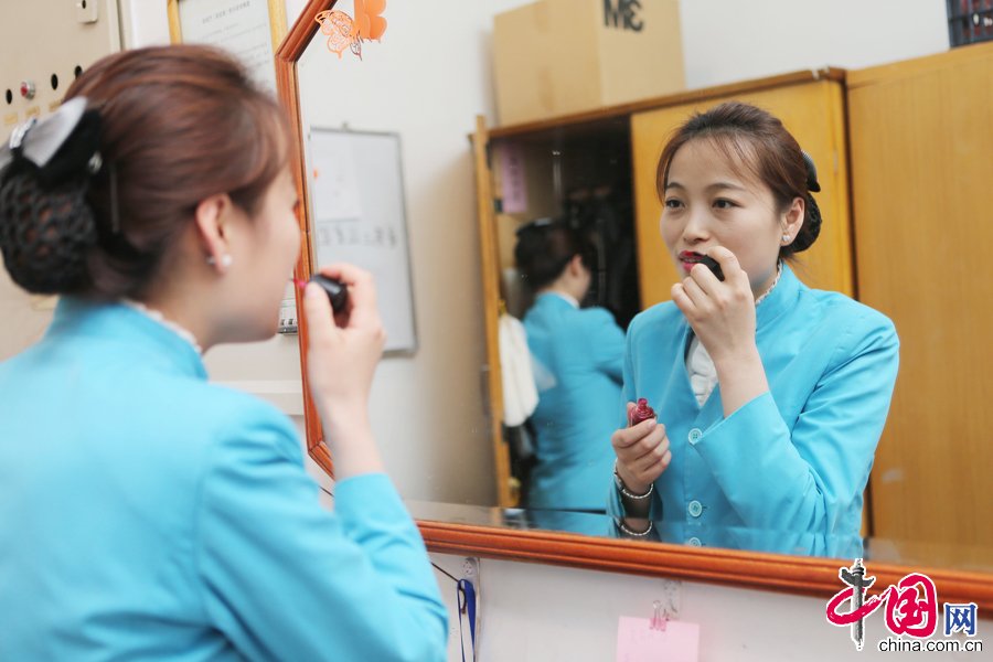 图为会议室旁边有一个很小的休息室,休息室内的墙壁上有一面大镜子,孙娜在上水间隙要注意检查仪容,抓紧时间补妆,保证以最好的精神面貌提供服务。