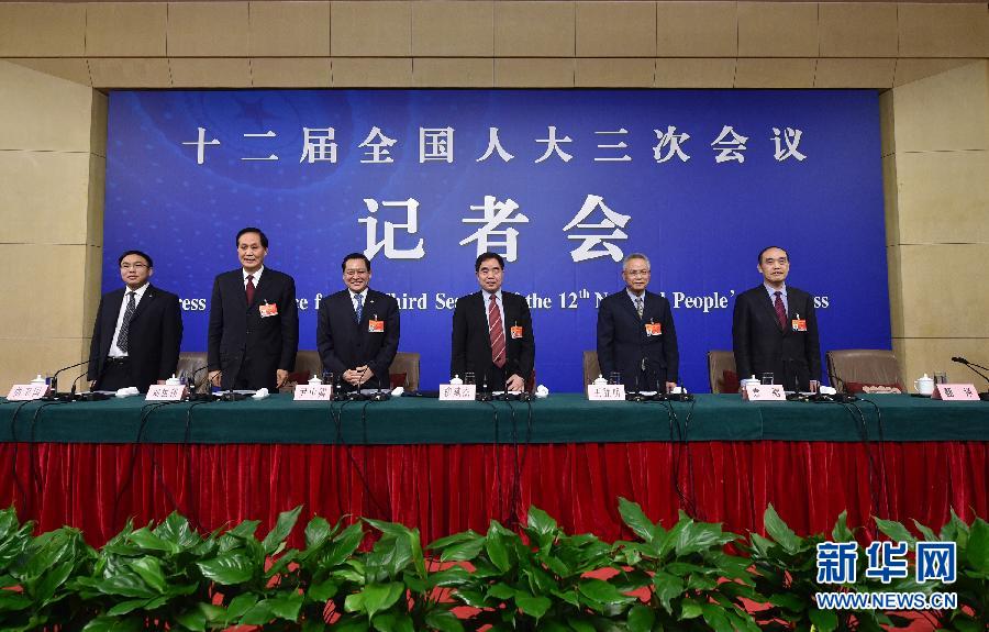3月10日,十二届全国人大三次会议新闻中心举行记者会,邀请全国人大教科文卫委员会主任委员柳斌杰、全国人大内务司法委员会副主任委员王胜明、全国人大财政经济委员会副主任委员尹中卿、全国人大环境与资源?;の被岣敝魅挝痹?、全国人大农业与农村委员会副主任委员刘振伟,就人大专门委员会与人大工作回答中外记者提问。新华社记者 李然 摄