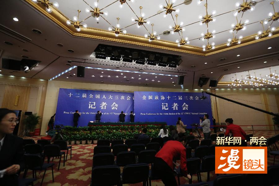 3月10日,在位于北京梅地亚中心的两会新闻中心,工作人员在一场记者会结束后更换背景板,为下一场会议做准备。 新华社记者 殷刚 摄