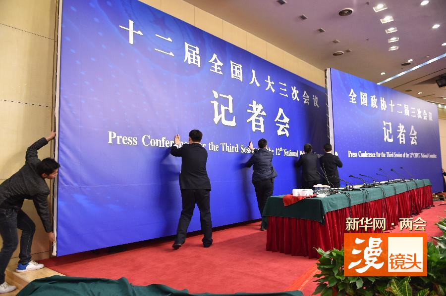 3月10日,在位于北京梅地亚中心的两会新闻中心,工作人员在一场记者会结束后更换背景板,为下一场会议做准备。 新华社记者 李鑫 摄