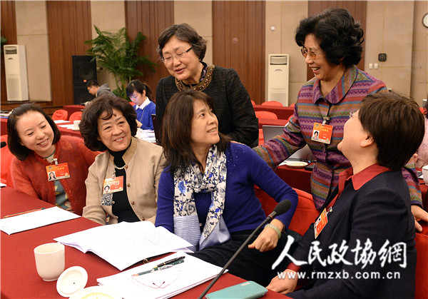 7日,教育界刘月宁、鲁景超、刘炎、柯杨、石定果、郑晓静(从左至右)六位委员热议政府工作报告,积极建言献策,用这种形式迎接“三八”妇女节的到来。 记者贾宁摄